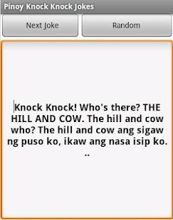 Funny Jokes Knock Knock Jokes For Android Apk Download. If you're bored, your at the right place! Enjoy this collection of funny knock knock pick up lines. Pwede po kayo mag add ng joke/pickupline/quote etc. Pinoy jokes, pick up lines, quotes, etc. Ganito ang scheme para tipid sa space. Tonight, my place, me and you. Please leave comments if you have more additions of your own! Are you looking for knock knock pick up lines to use? New tagalog pick up lines 2012. Contact pinoy knock knock jokes!